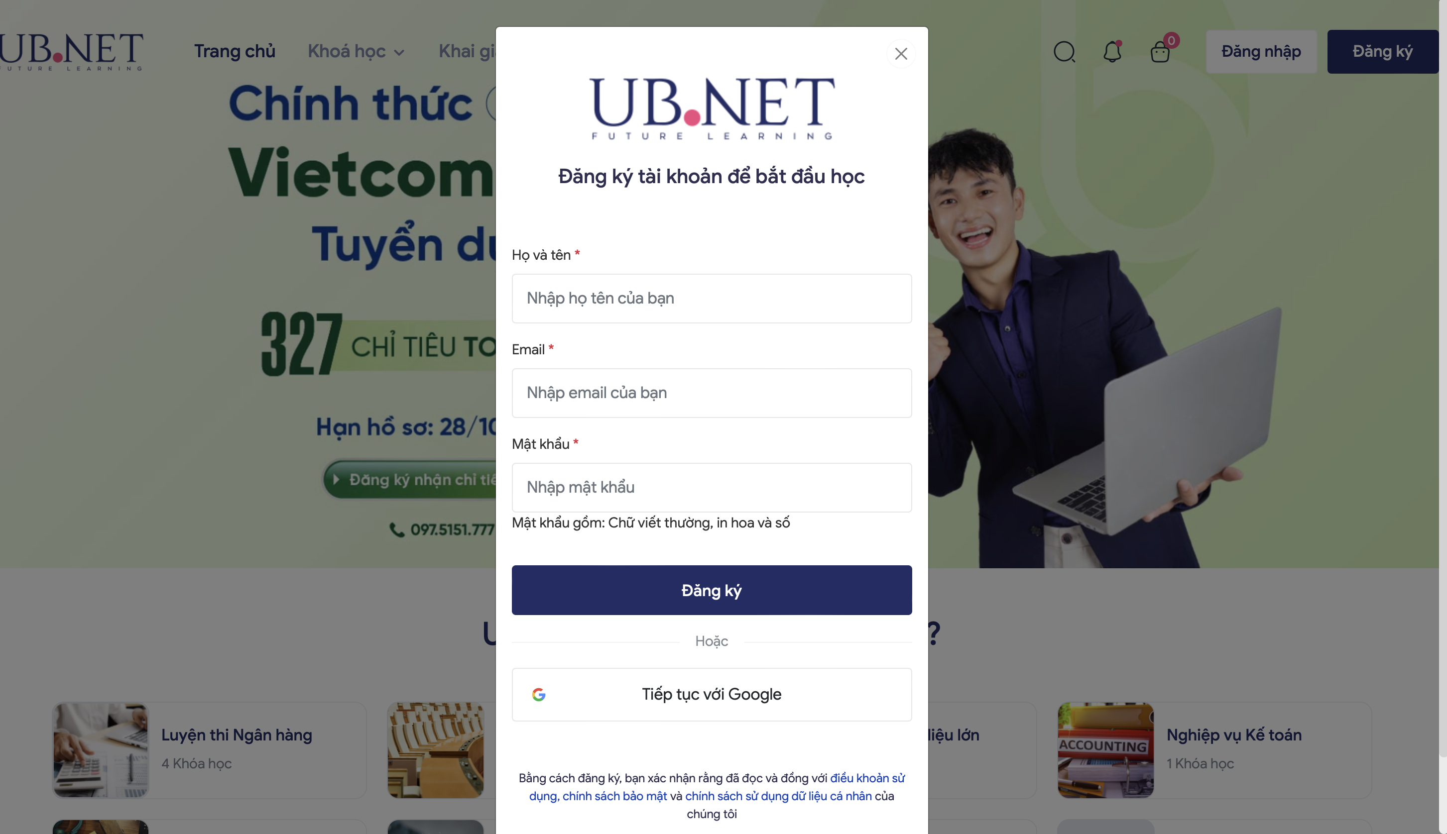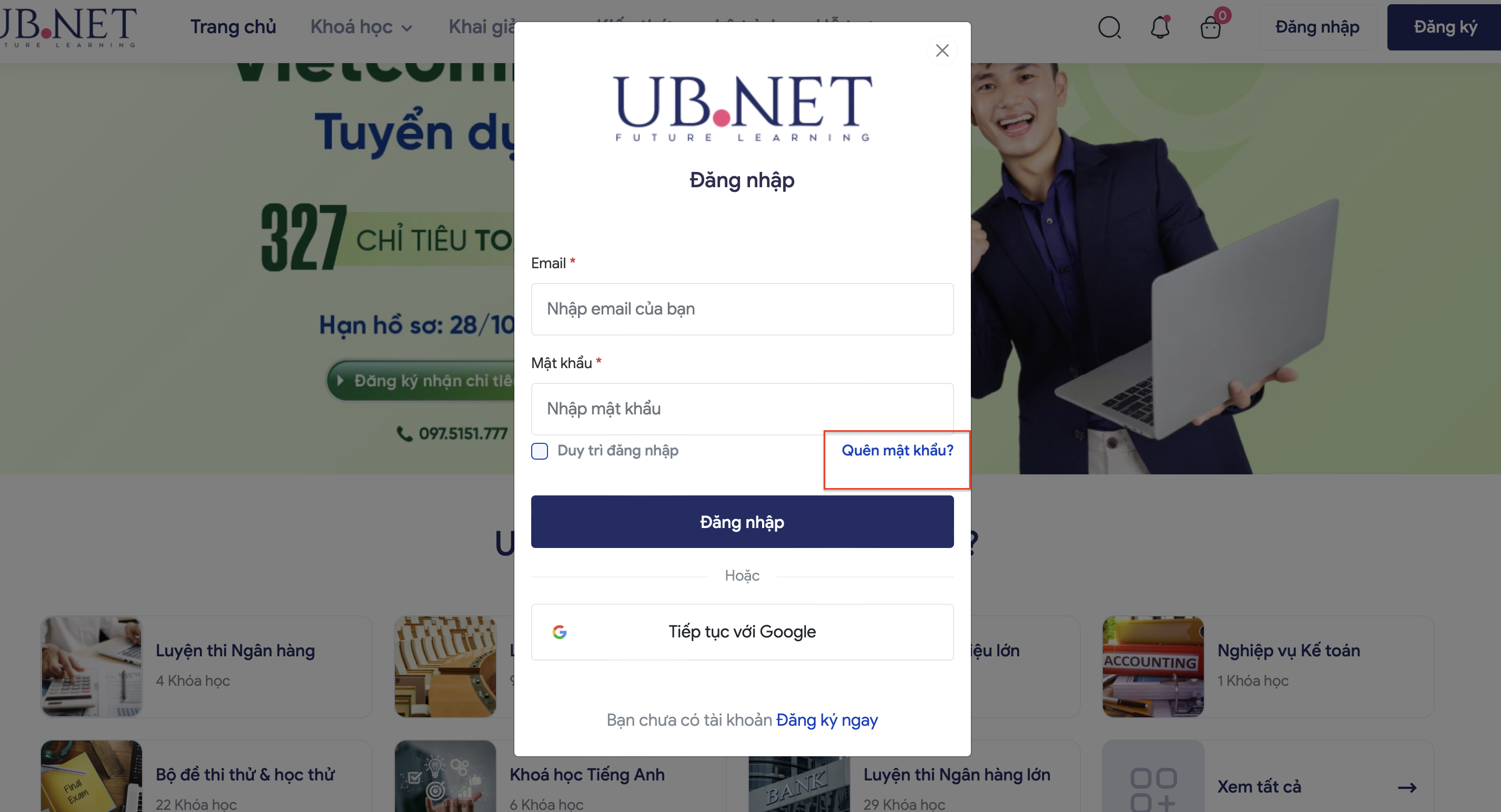 Quên mật khẩu: Để lấy lại mật khấu học viên nhấn vào đây: https://ub.net/