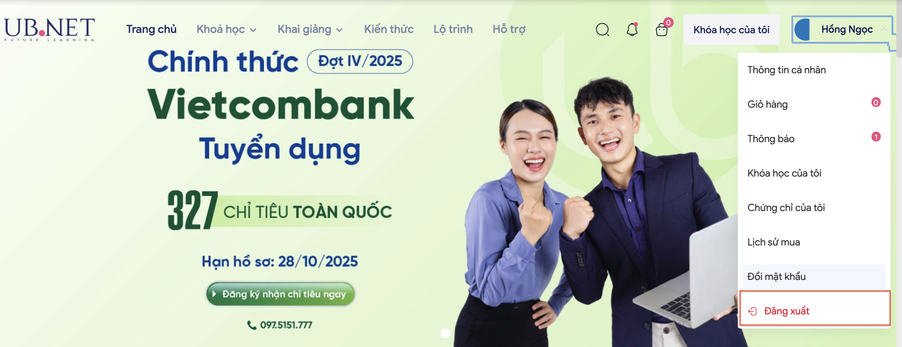 Trường hợp học viên thường xuyên hoặc do đặc thù công việc/thói quen cần sử dụng nhiều trình duyệt/thiết bị khác nhau để học tập, học viên nên tạo thói quen Đăng xuất (Logout) tài khoản học tập sau mỗi lần học tập. Thói quen này sẽ giúp học viên bảo mật thông tin cá nghân (tài khoản) và thuận lợi trong việc đăng nhập và học tập ở nhiều thiết bị khác nhau. Hình minh hoạ nút Đăng xuất như bên dưới: