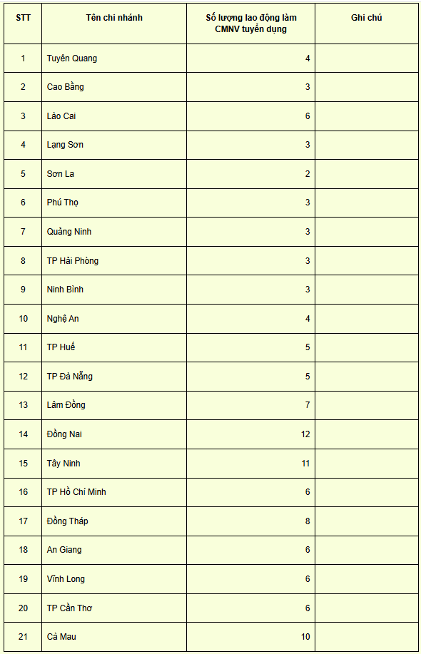- Riêng các chi nhánh ở vùng sâu, vùng xa, miền núi, hải đảo: chấp nhận thêm bằng ĐH các ngành Kinh tế, Quản trị kinh doanh