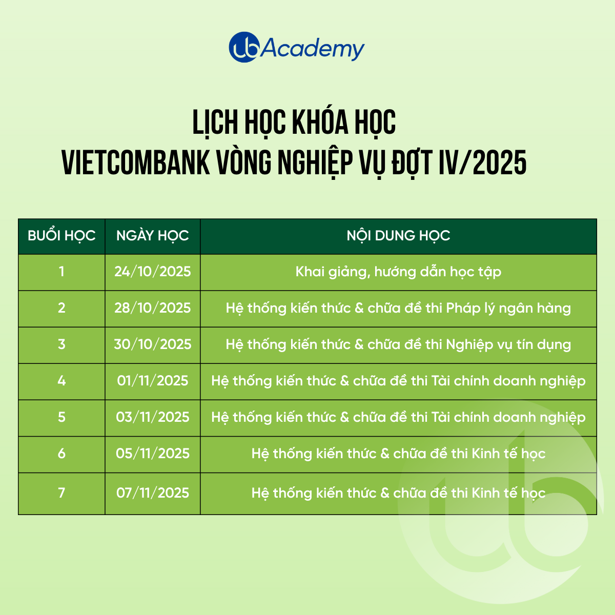 Nhằm giúp thí sinh chuẩn bị tốt nhất cho kỳ thi quan trọng này, UB Academy thông báo khai giảng lớp Luyện thi Vietcombank 2025 – Nghiệp vụ & Phỏng vấn, chương trình đào tạo chuyên sâu được thiết kế để học viên sẵn sàng chinh phục cả hai vòng thi: Nghiệp vụ và Phỏng vấn.