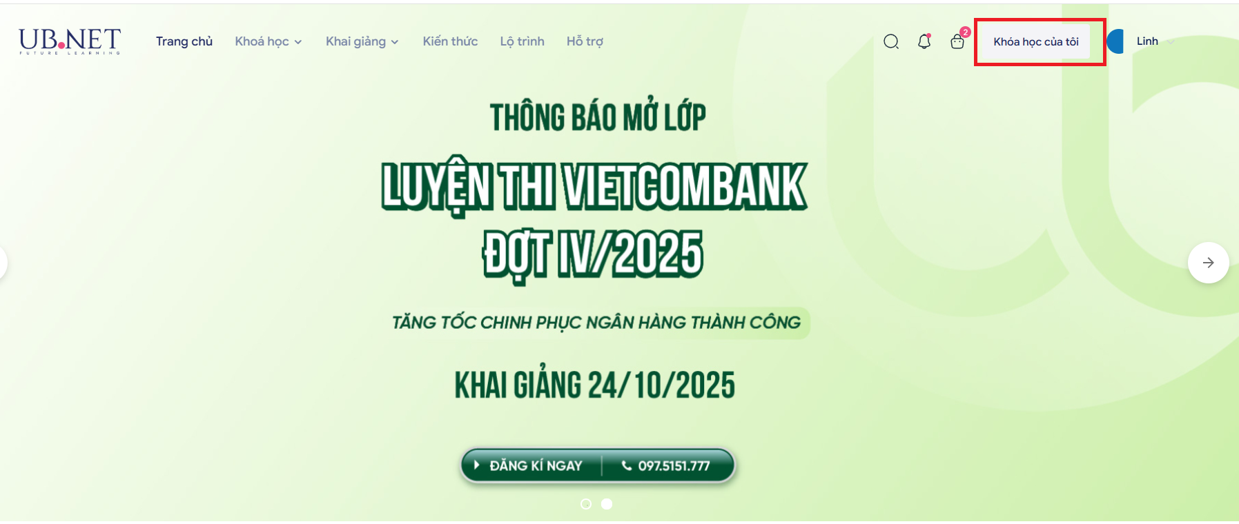 Giao diện sẽ tự chuyển sang hệ thống ub.net và học viên sẽ nhận được thông báo đã kích hoạt thành công khóa học