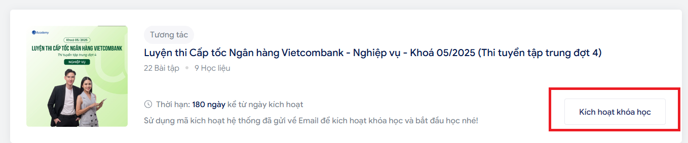 Nếu bạn chưa thấy xuất hiện khóa học Cấp tốc/tương tác bạn vui lòng Mở khóa theo hướng dẫn mở khóa sau đó quay lại kích hoạt khóa học: "Hướng dẫn mở khóa"