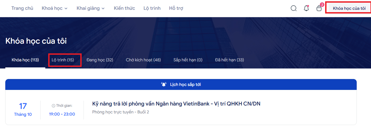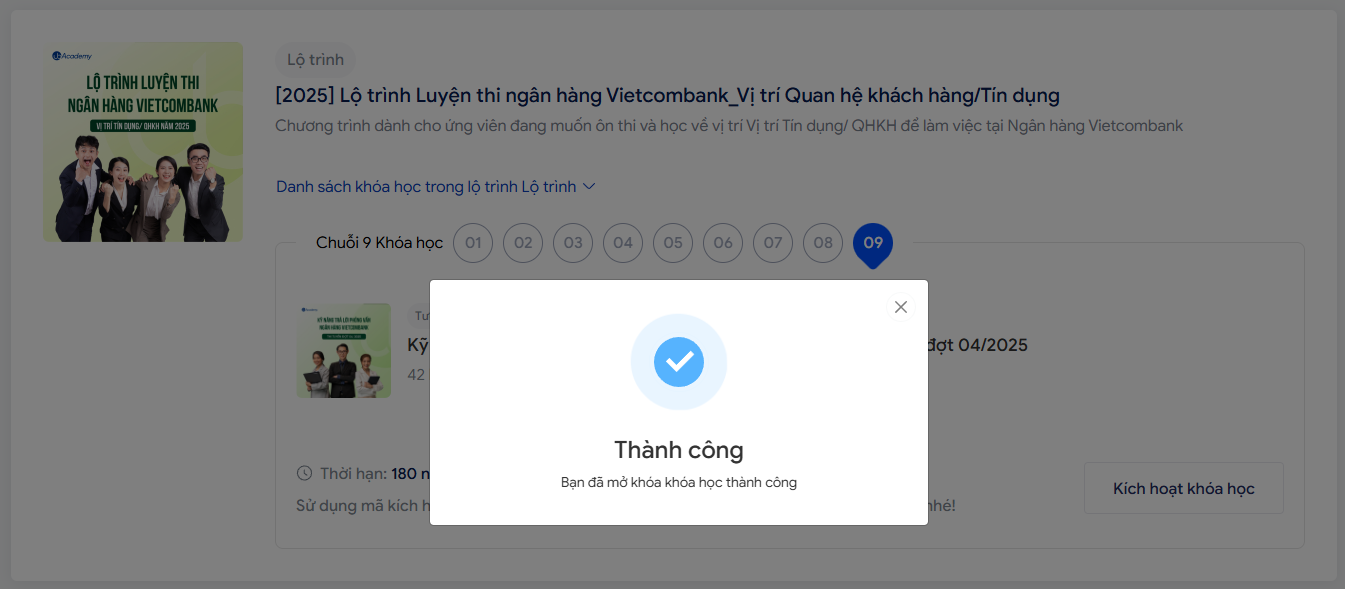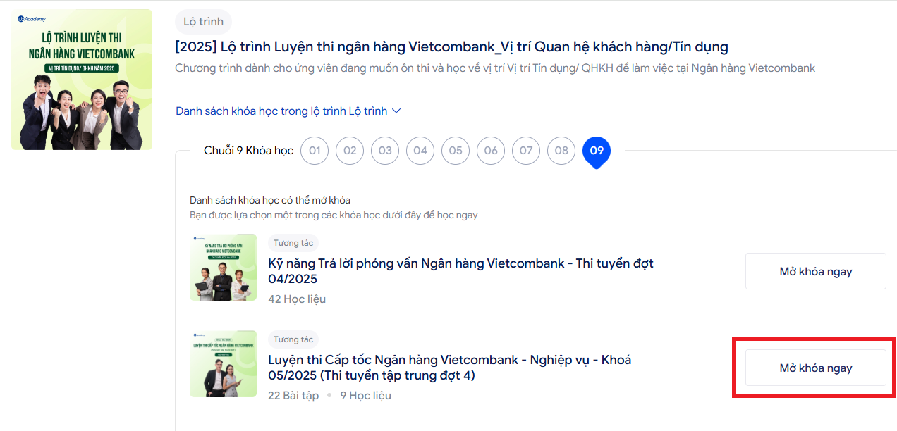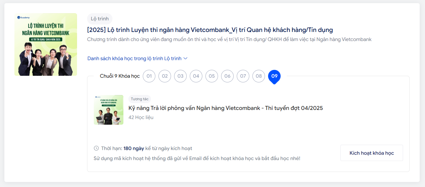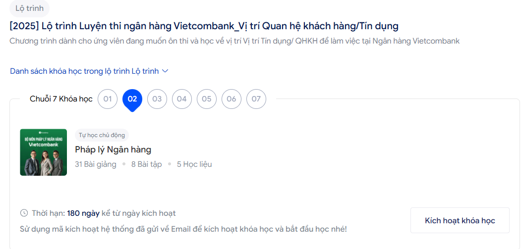 - Lộ trình của bạn gồm: 01 khóa Nghiệp vụ tại Ngân hàng Vietcombank: Bạn chỉ có 1 lần mở khóa để tham gia lớp học