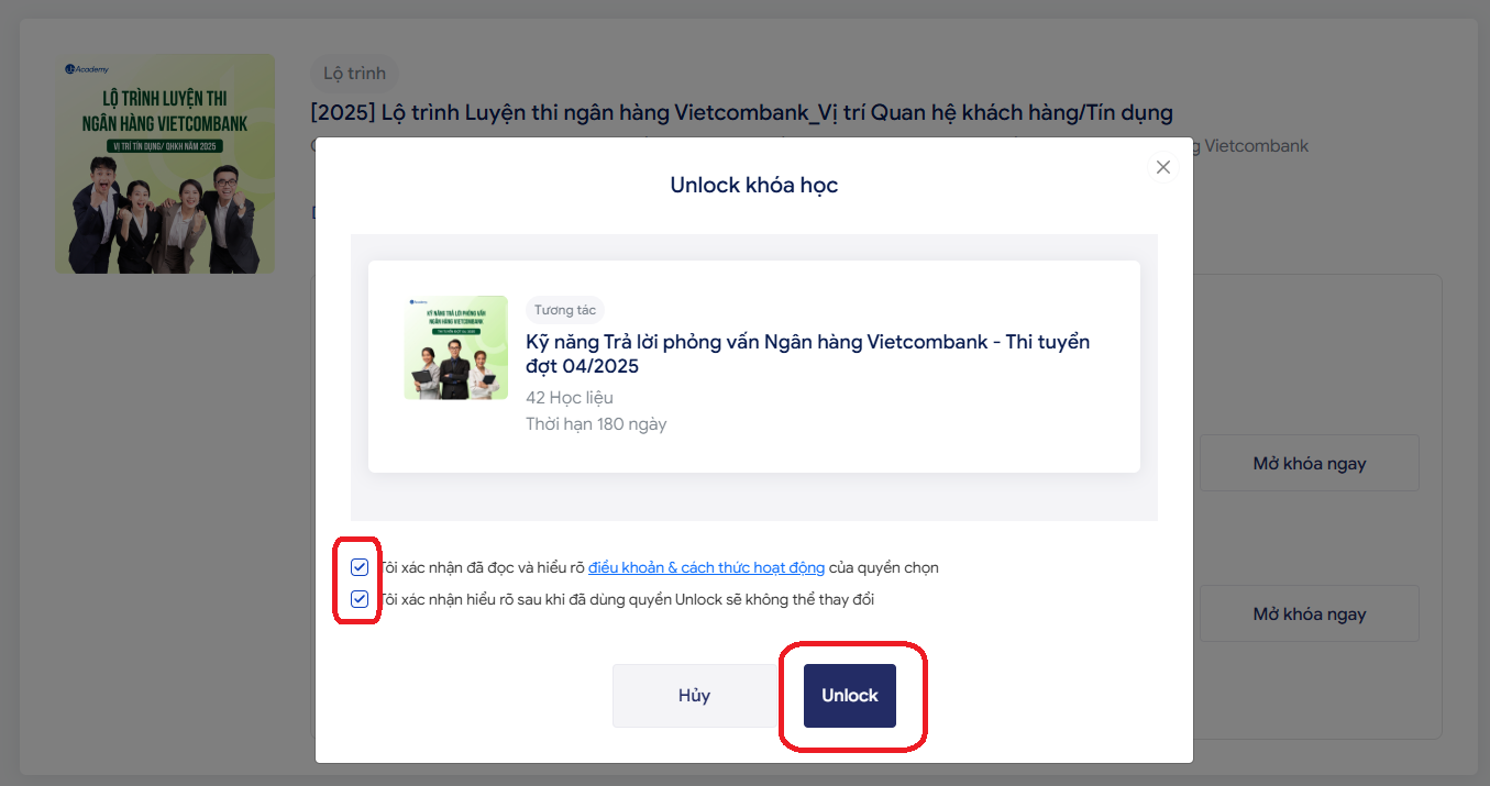 - Lộ trình của bạn gồm: 2 khóa Nghiệp vụ và Phỏng vấn Ngân hàng Vietcombank cả ghi hình và tương tác: Bạn có 2 lần mở khóa để tham gia lớp học